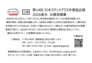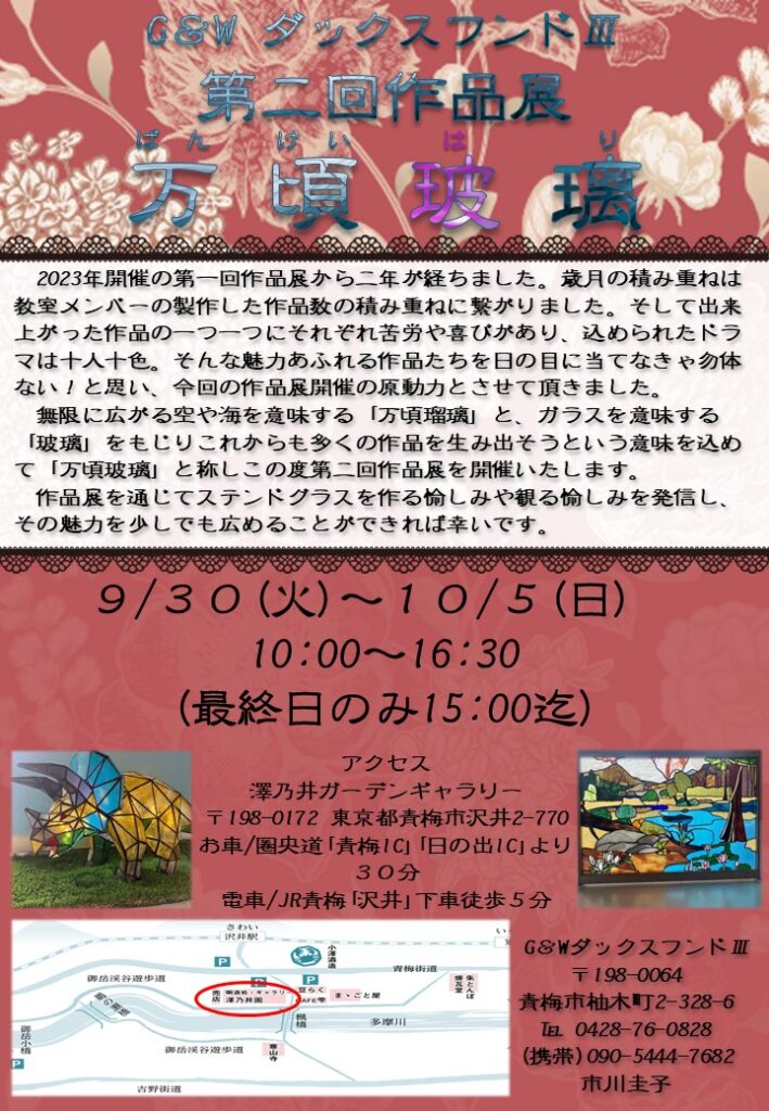 2025年8月30日 2025年8月30日 Web Master 展覧会 万頃玻璃(9/30-) 【会場】澤乃井ガーデンギャラリー〒198-0172 東京都青梅市沢井2-770 【日時】9/30(火)〜10/5(日)AM10:00〜PM4:30(最終日10/5(日)はPM3:00まで)